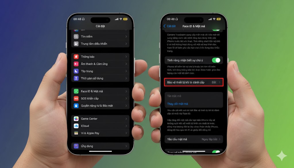 Kéo xuống và tìm mục Bảo vệ thiết bị khi bị đánh cắp, sau đó kích hoạt. Tính năng này giúp tăng cường lớp bảo vệ khi iPhone rơi vào tay người lạ.