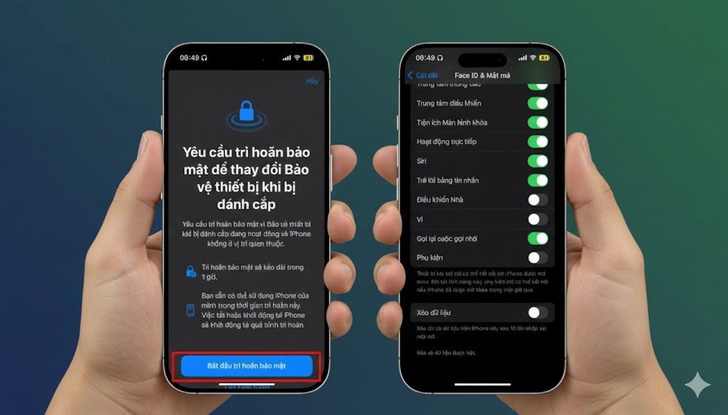 Chọn Bắt đầu trì hoãn và bảo mật. Khi được kích hoạt, hệ thống sẽ yêu cầu xác thực bổ sung và tạo thời gian chờ trước khi cho phép thay đổi các cài đặt quan trọng như mật khẩu Apple ID hoặc tắt Find My.