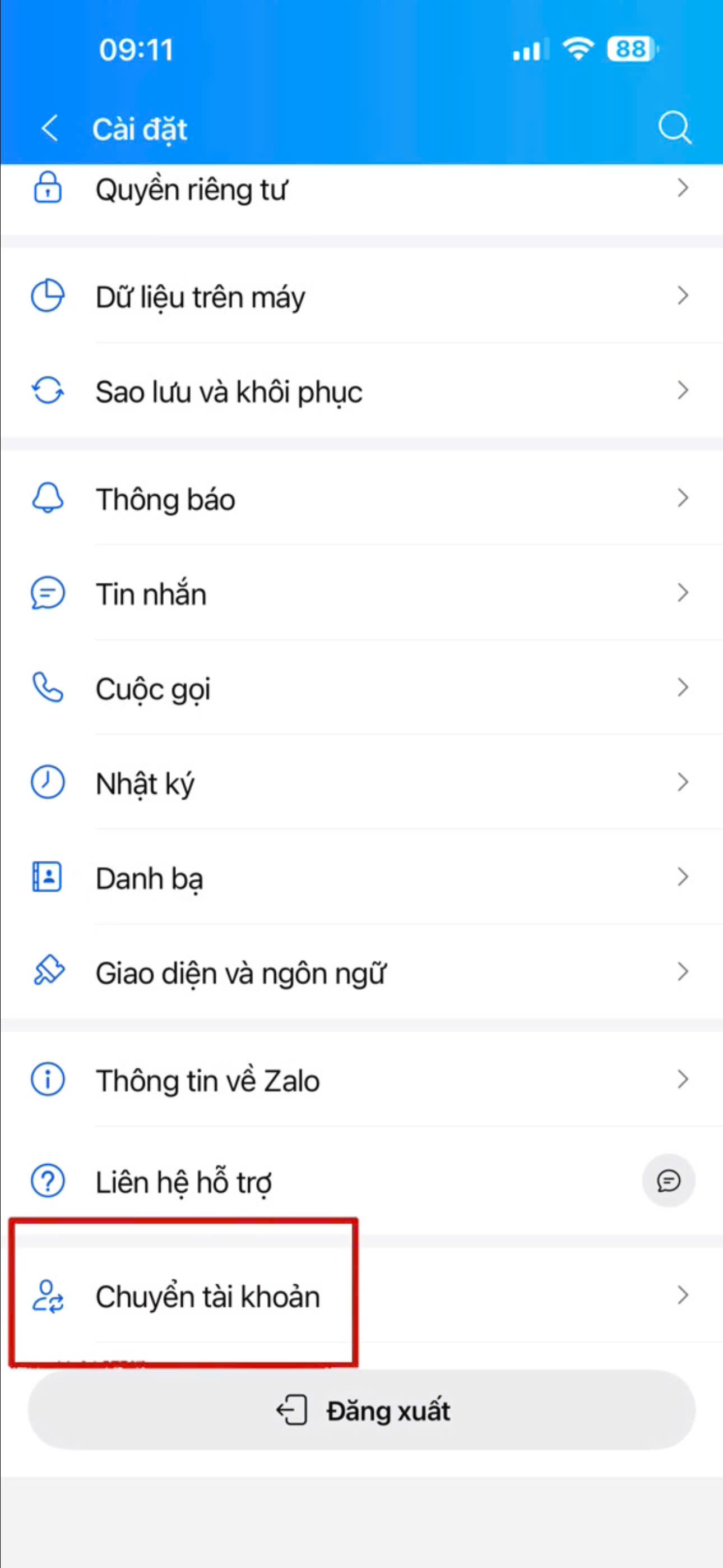 - Bước 2: Chọn Chuyển tài khoản: Bấm vào biểu tượng Cài đặt (hình bánh răng) ở góc trên, sau đó tìm mục Chuyển tài khoản.