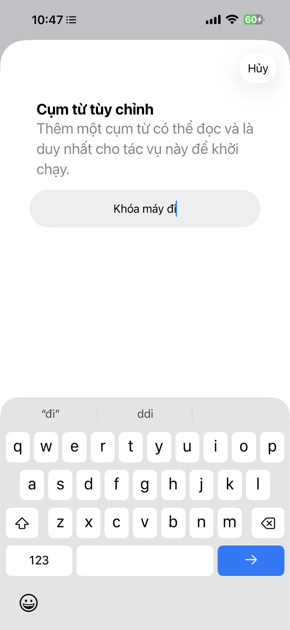 Nhập câu lệnh giọng nói bạn muốn sử dụng (ví dụ: “Khóa màn hình”, “Khóa máy”).