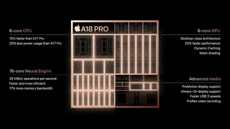 Một trong những điểm nhấn quan trọng của A18 Pro là Neural Engine 16 lõi, cho phép xử lý các tác vụ trí tuệ nhân tạo trực tiếp trên thiết bị: