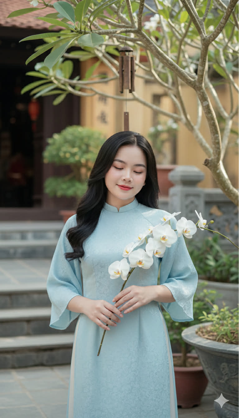 Sử dụng khuôn mặt giống 100% với ảnh được cung cấp, tạo nên một bức chân dung tuyệt đẹp, chất lượng cao. Một cô gái trẻ người Việt xinh đẹp, đứng dịu dàng trong khu vườn cổ truyền thống. Cô mặc một chiếc Áo dài cách thân rộng màu xanh pastel với chất liệu vải gấm, tay áo loe nhẹ. Mái tóc đen dài, uốn xoăn nhẹ phần đuôi, trang điểm tự nhiên, môi hồng nhạt. Cô cầm cành hoa lan hồ điệp trắng bằng cả hai tay, nhắm mắt mỉm cười nhẹ đầy thanh tao và duyên dáng. Phông nền là kiến trúc cổ Việt Nam, bậc đá, cây đại (sứ) có treo chuông gió, xung quanh là cây cảnh xanh mát và ánh nắng lọc qua tán lá. Ánh sáng mềm mại, ban ngày, tự nhiên, tạo cảm giác nhẹ nhàng, trong trẻo và đầy nữ tính. Bức ảnh mang phong cách thanh thuần, dịu dàng, cổ điển Việt Nam, tôn lên vẻ đẹp trong sáng của người con gái Á Đông. Phong cách ảnh: chân thực cao, điện ảnh, 8K, chi tiết cao, ánh sáng tự nhiên, tông màu nhẹ, bố cục cân đối, không gắt sáng. Góc máy: trung cảnh (medium shot), chụp từ chính diện hơi nghiêng, thấy toàn thân, tư thế đứng nhẹ nhàng tự nhiên