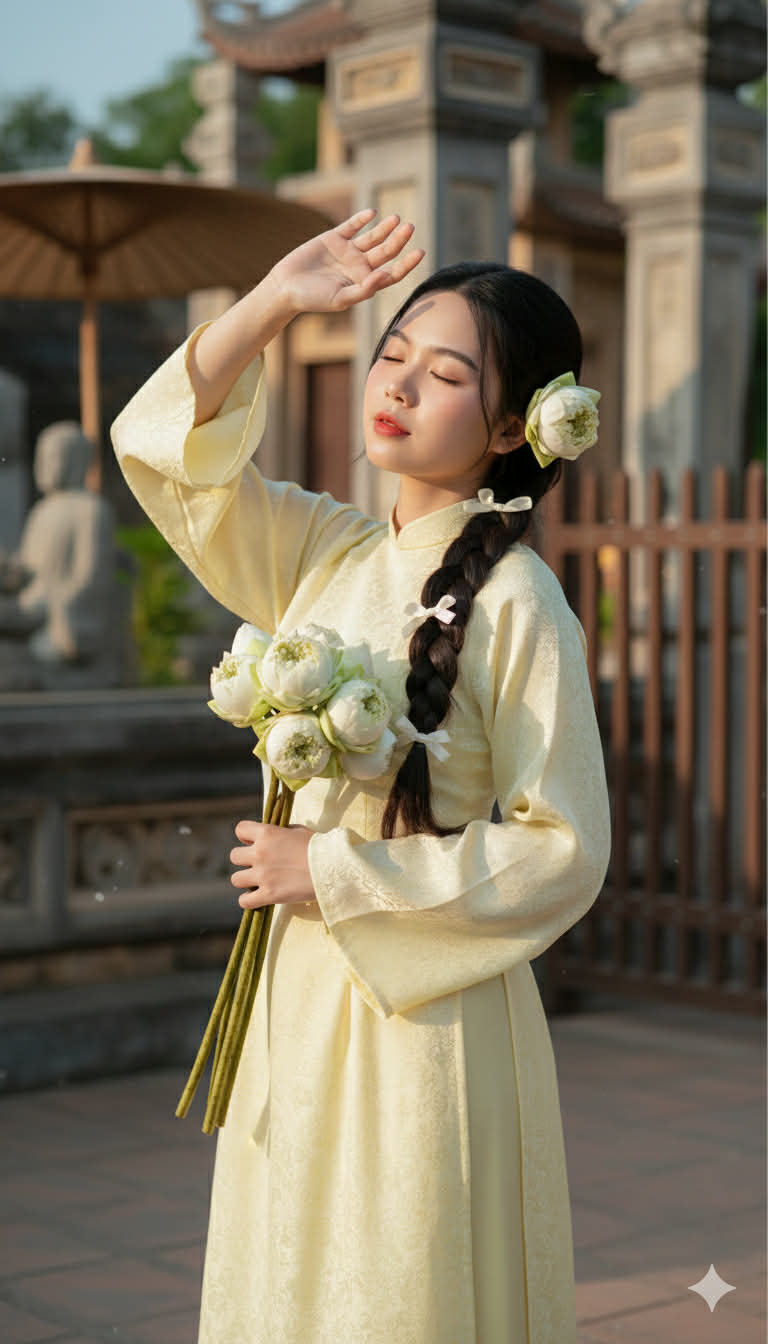 Sử dụng khuôn mặt giống 100% với ảnh được cung cấp, tạo nên một bức chân dung tuyệt đẹp, chất lượng cao. Chân dung toàn thân của một thiếu nữ Việt Nam dịu dàng. Cô mặc một chiếc Áo dài cách thân rộng màu vàng pastel với chất liệu vải gấm, tay áo loe nhẹ. Cô có tóc đen dài tết bím dày buộc các nơ trắng nhỏ giữa bím, kèm một bông hoa sen trắng cài vào phần tóc bên trái. Cô gái có làn da trắng hồng mịn màng, gương mặt trái xoan, môi hồng tự nhiên, đôi mắt khép hờ như đang cảm nhận ánh nắng dịu. Tay trái cô khẽ giơ lên che nắng, tay phải ôm bó hoa sen trắng xanh trước ngực. Ánh sáng: ánh nắng chiều ấm (golden hour) dịu, chiếu xiên nhẹ từ bên trái, tạo highlight mềm trên khuôn mặt và vải áo, bóng đổ mềm mại; điều kiện thời tiết: không gió mạnh, vài sợi tóc bay nhẹ để tạo cảm giác tự nhiên; Bối cảnh: nền là cột đá/cổng gỗ chùa cổ, hơi mờ (shallow depth of field, background bokeh) — có thể thấy bóng tượng/điêu khắc mờ ở hậu cảnh, cây lá xanh mờ; màu sắc: palette ấm, trắng ngà và xanh lá mơ, tông da ấm; Chi tiết chất liệu: kết cấu vải áo ren/lụa rõ nét, đường may, hoa văn gấm rất tinh xảo; cây dù có nan tre và chân nan hiện rõ; ánh phản xạ nhẹ trên trang sức (bông tai, dây chuyền mảnh nếu có); Phong cách ảnh: ultra-realistic, editorial portrait, cinematic lighting, high detail, 8k, photographic, medium format look, filmic grain rất nhẹ; Góc máy & bố cục: vertical portrait (toàn thân), crop hơi sát đầu và chân bị chừa một chút, tỉ lệ 2:3, góc chụp ngang tầm mắt người xem, slight 3/4 view; Cảm giác: thanh lịch, hoài niệm, truyền thống pha hiện đại, hoàn mỹ, mood nhẹ nhàng