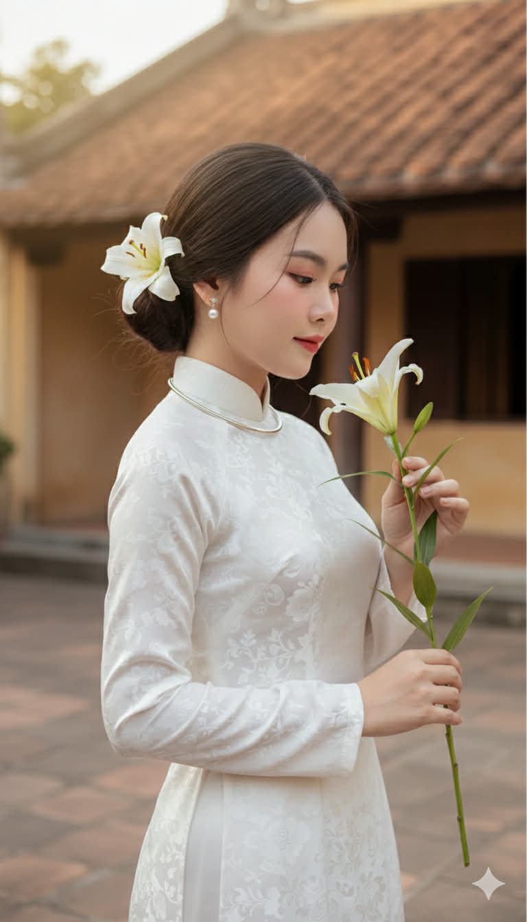 Create an ultra-realistic, 8K high-resolution portrait of a slim Vietnamese woman standing gracefully in soft morning sunlight. Keep her original facial features and natural expression from the uploaded reference — do not alter any facial structure. Outfit: She wears a traditional pure white silk áo dài with subtle brocade floral patterns. The dress has long, flowing sleeves, a high collar, and a refined, modest silhouette that enhances her gentle elegance. Accessories: A simple silver kiềng cổ (traditional Vietnamese neck ring), delicate pearl drop earrings, and a white lily flower held delicately in her hands. Pose: She stands softly in profile, gazing tenderly at the white lily in her hand. One hand gently holds the flower’s stem near her waist while the other hand lifts the blossom close to her face, as if admiring its fragrance. Her posture is graceful and feminine, evoking calm and nostalgia. Hair & Makeup: Hair neatly styled in a low bun, adorned with a white lily flower at the back. Makeup is Korean-style soft pink tone — glowing skin, light blush, rosy lips, and subtle eyeliner, giving a youthful and natural look. Background: A traditional Vietnamese courtyard with antique architecture, soft sunlight filtering through the tiled roof, warm beige walls, and patterned stone floor. The morning light highlights her face and the delicate texture of the silk fabric. Lighting & Style: Golden-hour natural light, cinematic tone, warm color palette, shallow depth of field, detailed textures, soft shadows, elegant Vietnamese vintage aesthetic.