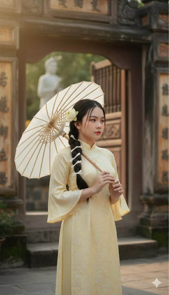 Sử dụng khuôn mặt giống 100% với ảnh được cung cấp, tạo nên một bức chân dung tuyệt đẹp, chất lượng cao. Chân dung toàn thân của một thiếu nữ Việt Nam dịu dàng. Cô mặc một chiếc Áo dài cách thân rộng màu vàng pastel với chất liệu vải gấm, tay áo loe nhẹ. đứng nghiêng thân về bên phải trước cổng chùa cổ bằng gỗ; cô cầm một ô giấy trắng truyền thống (parasol) đặt nghiêng trên vai, tay trái nắm nhẹ cán, tay phải để ngang bụng; tóc đen dài tết bím dày buộc các nơ trắng nhỏ giữa bím, kèm một bông hoa sen trắng cài vào phần tóc bên trái; gương mặt nhìn hơi nghiêng sang phải, ánh mắt dịu dàng, biểu cảm trầm lặng, thanh thoát, lớp trang điểm tự nhiên tông hồng đào, môi hồng nhạt, da mịn như sứ; Ánh sáng: ánh nắng chiều ấm (golden hour) dịu, chiếu xiên nhẹ từ bên trái, tạo highlight mềm trên khuôn mặt và vải áo, bóng đổ mềm mại; điều kiện thời tiết: không gió mạnh, vài sợi tóc bay nhẹ để tạo cảm giác tự nhiên; Bối cảnh: nền là cột đá/cổng gỗ chùa cổ, hơi mờ (shallow depth of field, background bokeh) — có thể thấy bóng tượng/điêu khắc mờ ở hậu cảnh, cây lá xanh mờ; màu sắc: palette ấm, trắng ngà và xanh lá mơ, tông da ấm; Chi tiết chất liệu: kết cấu vải áo ren/lụa rõ nét, đường may, hoa văn gấm rất tinh xảo; cây dù có nan tre và chân nan hiện rõ; ánh phản xạ nhẹ trên trang sức (bông tai, dây chuyền mảnh nếu có); Phong cách ảnh: ultra-realistic, editorial portrait, cinematic lighting, high detail, 8k, photographic, medium format look, filmic grain rất nhẹ; Góc máy & bố cục: vertical portrait (toàn thân), crop hơi sát đầu và chân bị chừa một chút, tỉ lệ 2:3, góc chụp ngang tầm mắt người xem, slight 3/4 view;