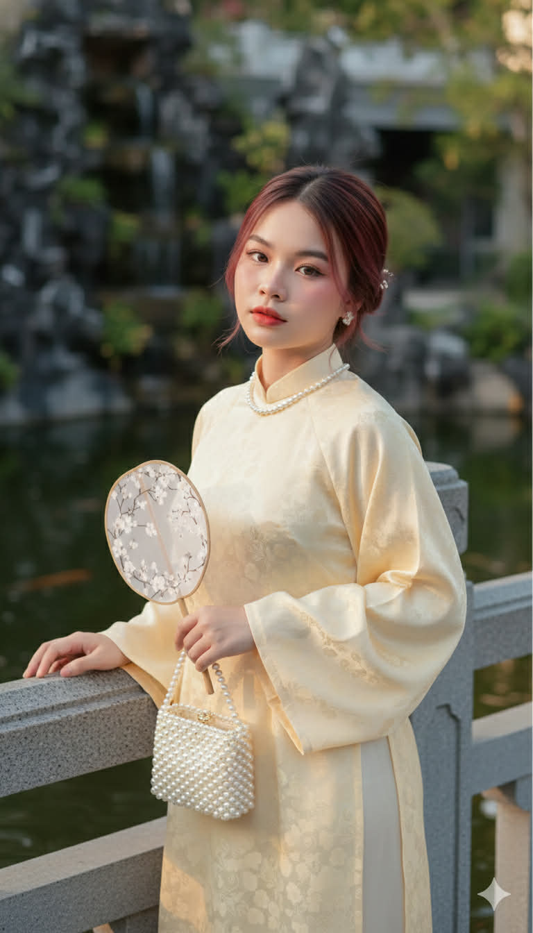 Sử dụng hình ảnh tôi cung cấp, giữ cho giống nét mặt 100%, giúp tôi tạo một bức ảnh chân dung cô gái có bối cảnh thơ mộng, là một cô gái đứng tựa người vào hành lan cầu đá, đầu hơi nghiêng nhẹ.tay trái cô cầm một chiếc túi xách ngọc trai nhỏ. Tay phải cầm một cây quạt trắng nhỏ xinh ,họa tiết hoa văn tinh xảo,cô mặc trang phục áo dài truyền thống rộng, màu vàng kem pastel vải gấm, hoa văn in nhỏ, áo rộng rải tay áo rộng. Cô trang điểm tone hồng má hồng xinh xắn nhẹ nhàng quyến rũ, tóc cô nhiều búi thấp lệch qua bên phải nhẹ, bông tai Ngọc trai sắc xảo. cô đeo một sợi chuỗi Ngọc trai ngắn nhỏ, làn da trắng sáng bắt ánh nắng vàng, khung cảnh sau cô là hồ non bộ, suối chảy ao cá nhưng có vẻ hơi mờ dần để cô gái trở thành tâm điểm chính. Cô nhìn nhẹ sang ống kính, vẻ mặt mơ mộng.