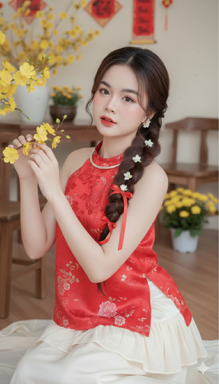 Đừng thay đổi các đường nét khuôn mặt của ảnh gốc. Tạo giúp tôi 1 bức ảnh chủ đề tết :Một phụ nữ trẻ Việt Nam xinh đẹp trong ánh sáng ban ngày dịu nhẹ. Cô mặc một chiếc áo yếm Việt Nam không tay màu đỏ \ (họa tiết hoa chìm chỉ kem) - một chiếc áo yếm lụa có cổ yếm làm bằng kiềng bạc, áo dáng rộng, loe ra kết hợp với một chiếc váy màu kem pastel mềm mại ba tầng bằng vải lụa và voan mỏng tạo vẻ ngoài mềm mại và bồng bềnh.Nước da trắng, Trang điểm mắt aegyo sal (bọng mắt nổi bật) với phấn bắt sáng dưới mắt. Hàng mi cong dài làm nổi bật đôi mắt hai mí. Phấn má hồng nhẹ nhàng tạo nên vẻ ngoài ngọt ngào. Môi bóng, hiệu ứng son chuyển màu (ombre) từ hồng đào ở giữa ra khóe mắt Mái tóc nâu đen dài nhiều, đánh phồng chân tóc tự nhiên, hơi rẽ ngôi giữa, một vài sợi tóc rơi tự nhiên ôm lấy khuôn mặt mềm mại. Tết tóc một bên dài qua eo, điểm xuyết những chiếc ruy băng buộc nơ nhỏ dài đỏ và điểm xuyết những bông hoa nhài nhỏ trên tóc tết. Hoa tai hình hoa kem nhỏ. Móng tay dài hình oval bóng trong. Dáng ngồi/quỳ lơi trên mặt sàn/ghế, tay đưa lên cao, hướng về phía trước, nhẹ nhàng tương tác với không gian (có thể chạm vào cành hoa hoặc đặt lơi trong không khí).Tạo đường cong mềm mại cho cơ thể. Tư thế tay giúp khoe trọn khuôn mặt, cổ và đường viền của chiếc yếm, đồng thời tạo cảm giác lãng mạn, mơ màng.Bối cảnh Bối cảnh là studio chụp hình tết Việt Nam được trang trí các câu đối liễn đỏ ,bàn và ghế gỗ Kĩ thuật Chụp Góc chụp: Chủ yếu là bán thân (medium close-up), t Góc chụp hơi chếch nhẹ hoặc ngang tầm mắt. Ánh sáng: Sử dụng ánh sáng tự nhiên mềm mại (có thể là ánh sáng khuếch tán từ cửa sổ hoặc ánh sáng ngoài trời vào buổi sáng/chiều tà), giúp tôn lên lớp nền căng bóng và độ trong trẻo của khuôn mặt. Xóa phông (Bokeh): Mức độ xóa phông rất mạnh, khiến hậu cảnh hoàn toàn mờ ảo, tạo hiệu ứng chiều sâu và tập trung tuyệt đối sự chú ý vào mẫu ảnh. Màu sắc: Ảnh có tone màu sáng, ấm (warm tone) và hơi mờ ảo/hoài cổ (vintage/dreamy filter) nhẹ, phù hợp với không khí Tết truyền thống và concept nàng thơ.