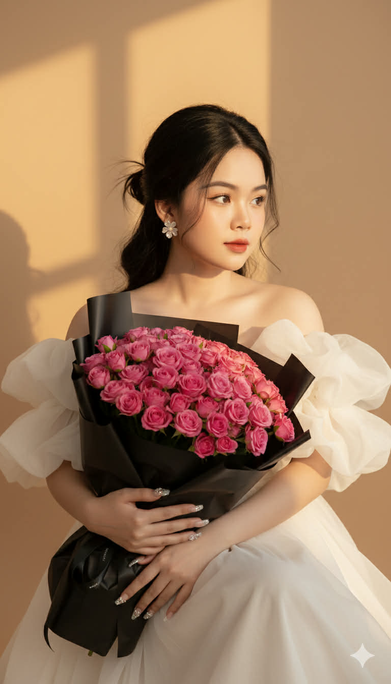 Chỉnh sửa ảnh đã tải lên siêu thực tế 100%, bằng cách sử dụng khuôn mặt gốc làm tham chiếu. Tạo ảnh Chân dung điện ảnh trong studio của một cô gái trẻ Đông Á thanh lịch và rạng rỡ, được chụp dưới ánh sáng vàng dịu nhẹ của ánh nắng mặt trời. Mái tóc dài, đen, uốn lượn của cô được búi nhẹ nhàng phía sau, với vài lọn tóc tự nhiên buông lơi quanh khuôn mặt. Phần tóc sát da đầu được tạo phồng tự nhiên, không bị ép sát, tạo cảm giác mềm mại và bồng bềnh. Một vài sợi tóc mảnh rơi nhẹ quanh trán và má, mang lại vẻ đẹp tự nhiên và đầy tinh tế. Cô đeo hoa tai hoa trắng nhẹ nhàng như một điểm nhấn duyên dáng. Móng tay dài được trang trí bằng đá pha lê, lấp lánh. Biểu cảm của cô bình thản, với nụ cười nhẹ và ánh mắt mở to, nhìn về phía bên phải khung hình. Trong tay cô là một bó hoa hồng nhí màu hồng đậm, rất lớn, được gói trong giấy màu đen theo phong cách tối giản và hiện đại. Cô ngồi trong tư thế tự nhiên, duyên dáng. Cô mặc một chiếc đầm voan trắng ngà trễ vai, dáng xòe, bay bổng, với các chi tiết vải xếp tầng, bồng bềnh và xa hoa quanh ngực và vai, gợi liên tưởng đến những đám mây mềm mại hoặc cánh hoa. Phông nền là một bức tường màu be ấm, được chiếu sáng dịu nhẹ bằng ánh sáng mặt trời tự nhiên, tạo ra bóng đổ nhẹ nhàng và chiều sâu. Tông màu tổng thể: ấm áp, pastel, kem, lãng mạn và nữ tính — mang phong cách nhiếp ảnh studio cao cấp chuyên nghiệp với ánh sáng điện ảnh. Từ khóa phong cách: Ảnh bìa tạp chí Vogue, Chân dung nghệ thuật, Hiệu ứng bokeh mịn, Trang điểm cao cấp, Kết cấu tinh xảo, Chi tiết làn da chân thực, Thiết lập ánh sáng studio chuyên nghiệp, Thiết bị: Leica SL2 với ống kính APO-Summicron-SL 90mm T/2, f/2, ISO 100, 1/250s, 8K Ultra HD, độ chân thực hoàn hảo. Tông màu: hồng phấn nhạt, trắng kem, ánh vàng ấm, bóng đổ màu đào nhẹ. Bố cục: cận cảnh, góc chụp ngang tầm mắt, độ sâu trường ảnh nông tập trung vào khuôn mặt, hậu cảnh điện ảnh mờ ảo
