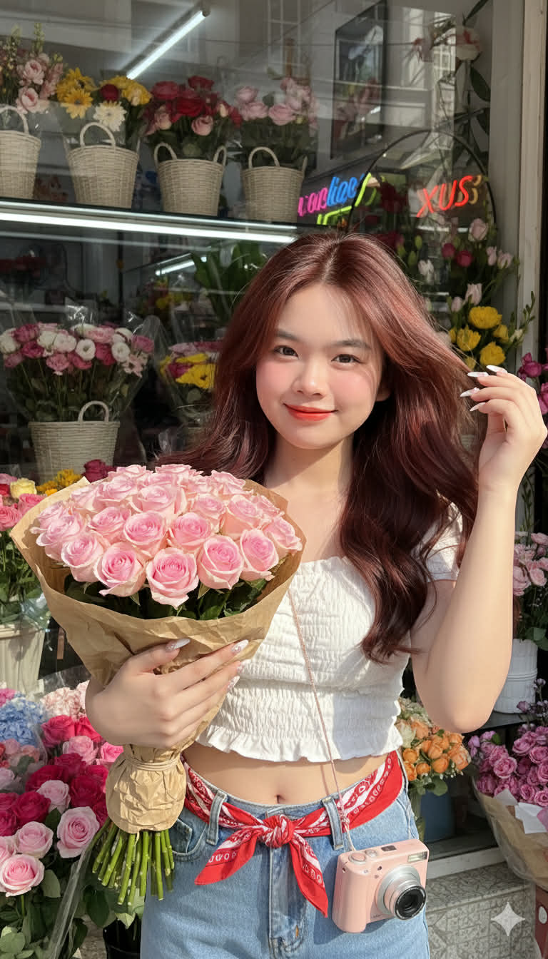 A daytime photo of a young woman taken with a 2000s Canon IXUS digital camera, with a powerful compact flash. (100% original face and features preserved; no alterations.) A cheerful-looking young woman stands in front of a flower shop in the soft afternoon sunlight. She's wearing a white crop top with a ruffled hem, revealing her naturally large breasts and waist, and low-rise jeans with a red and white striped bandana tied in front. One hand holds a large bouquet of light pink roses wrapped in paper, while the other hand naturally touches her hair. Her long, wavy, dark brown hair flutters gently in the breeze. Her complexion is smooth and radiant, with a warm smile and rosy cheeks. A light pink digital camera hangs on her wrist, serving as a cute prop. Behind her is a flower shop filled with colorful flowers in tightly arranged baskets, reflected in the mirror and neon lights. The overall atmosphere is bright, warm, and romantic. Hair is in its original style, with a few strands covering her face, flowers removed from her ears, blowing in the wind. She's chic, cool, and sexy, with slightly messy layers. She wears pink blush, a rosy cheek and nose, and orange-pink lips. She's got French manicures. Looking directly at the camera, her expression is cute, dreamy, innocent, and playful. The Canon IXUS flash hits her face directly, brightening her skin with a slight yellowish-white hue, like a compact camera. Hard shadows are cast behind the subject. The image is sharp and detailed, with the resolution of a 2000s digital camera. The colors are vibrant, not too smooth, and there's a slight amount of noise, just like a real IXUS image. Overall atmosphere: A photo taken with a strong flash in the style of a 2000s Canon IXUS, during the day, in a flower shop.