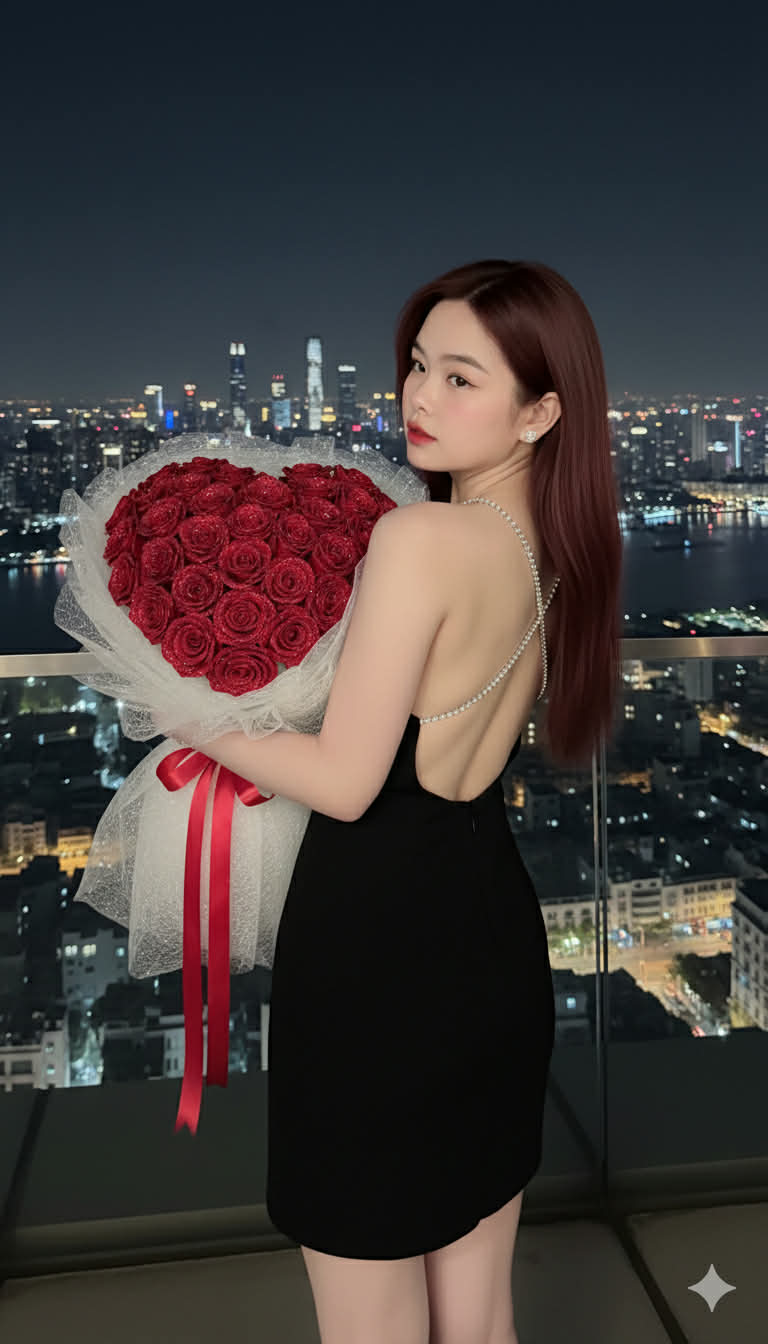 Create an image with the exact same face as the reference (1000% unchanged). Fair, dewy glossy white skin with a soft pink glow. Slightly curvy figure, body angled to the side. Outfit & Look: A woman wearing a short black evening dress, open-back, sexy yet elegant, featuring thin rhinestone/crystal chain straps crossing in an X shape at the back. Long straight dark brown/mahogany hair, waist-length, draped over the right shoulder, healthy and shiny. Natural / no-makeup makeup, glass-skin finish, soft pink blush, natural pink lips. Pose & Props: Back view, facing the city, holding a very large heart-shaped bouquet of red glitter roses against the left side of the chest. Bouquet wrapped in white mesh/tulle, fluffy and voluminous, with a red ribbon hanging down. Background & Mood: Luxury rooftop bar or fine-dining rooftop with glass railing. Night city skyline, skyscrapers and glowing lights, a large river reflecting city lights (Asian metropolitan vibe). Romantic, luxurious, private, special-occasion mood (Valentine’s, anniversary, birthday). Lighting & Camera: Strong direct flash on the subject for high contrast; background city lights create subtle bokeh. Shot on 24–35mm (full-frame equivalent) or standard mobile lens, sharp focus on the subject.