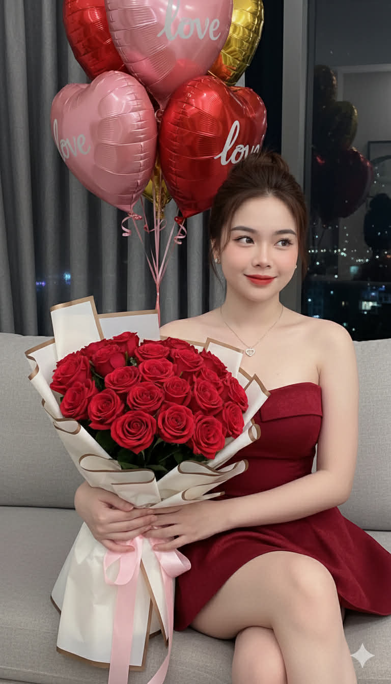 Use the attached image as the primary reference image (Strict Reference Image 100%). Retain all facial features and identity from the reference image 100%. Create an ultra-realistic romantic indoor portrait of a single woman. A woman sits on a light gray fabric sofa in a living room at night, holding a large bouquet of red roses close to her body. Pink, red, and gold heart-shaped foil balloons are behind her, creating a romantic and warm atmosphere, like a special occasion or anniversary. Attire: Wearing a dark red/wine red strapless dress. The fabric has a slight texture, looking luxurious, simple, yet just the right amount of sexy. The dress is thigh-length. A heart-shaped pendant necklace is worn. Hairstyle: A high bun roll with strands of hair framing the face. Makeup: Sweet, natural makeup with a touch of luxury. Long, naturally curled eyelashes. Smooth, slightly dewy skin. Peach-pink blush. Light eye makeup, thin eyeliner, natural eyelashes. Pinkish-red lips, looking moist. Physical expression and emotion: A gentle, sweet smile. Soft eyes, looking slightly away from the camera. Romantic and tender, not a wide smile. Posture: Slightly reclined on the sofa, one arm around the bouquet, the other holding the ribbon. Relaxed, natural posture. Accessories: Wearing a delicate necklace with a small pendant, simple small earrings. No large or prominent jewelry. Props: A bouquet of bright red roses wrapped in white paper with brown borders and tied with a light pink ribbon. Heart-shaped foil balloons with the word "love" printed on them. Scene: Indoor living room with a gray sofa and dark sheer curtains. A glimpse of city lights outside the window in the background. Lighting and Tone: Soft flash or camera light in an indoor night style. Warm, pinkish-red tone with minimal grain for a realistic photographic feel. Slightly blurred background. Focus on the subject. Camera Angle: Eye level, half-body to third-quarter shot. Vertical framing. Image Quality: Ultra-realistic, High detail, Soft light, Natural skin texture. Cinematic romantic mood. Aspect Ratio: 9:16, High Resolution 8K.